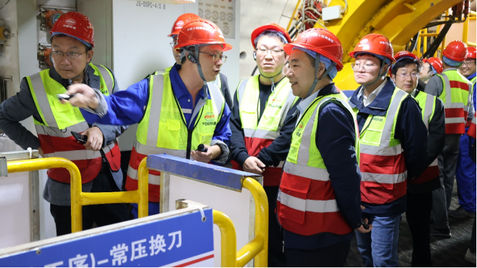 走进隧道,一行人重点了解成型隧道及中隔墙现浇结构施工关键技术及精细控制,实地感受了项目5S、SOP标准化管理及条块化穿透式安全管理成效。登上盾构机后,一行人查看了掘进情况,了解同步注双液浆技术、成型隧道不渗不漏关键技术应用以及TPM设备精益化管理成效。